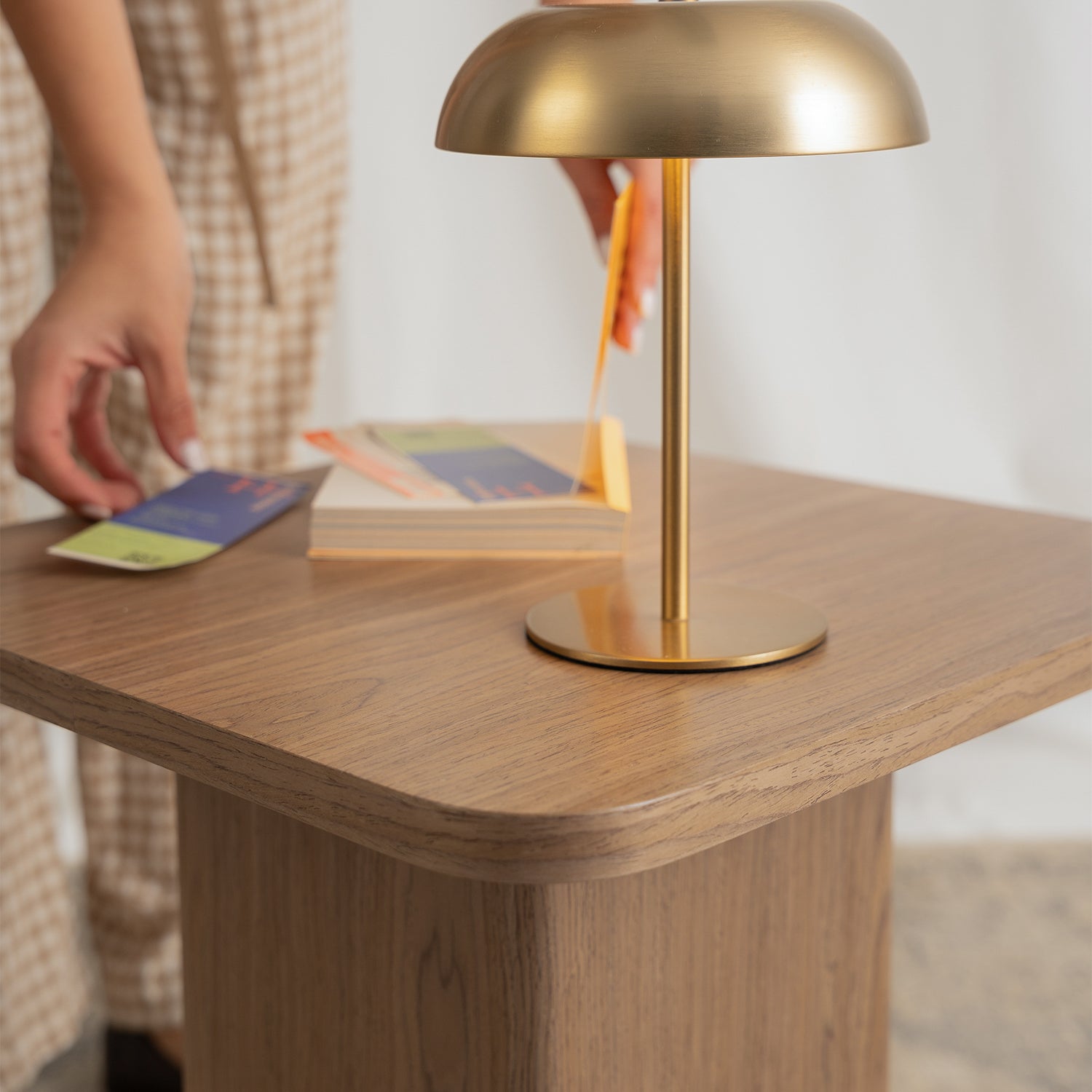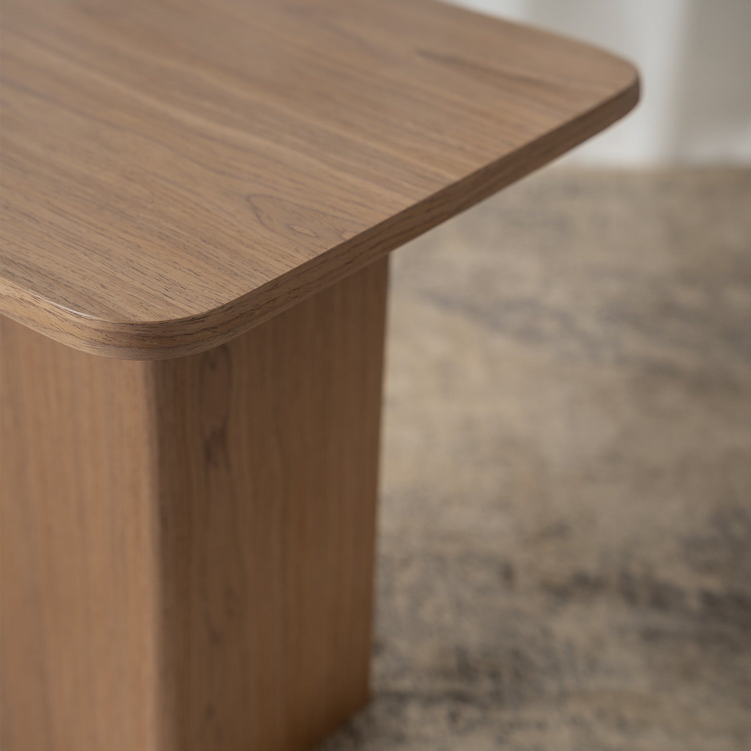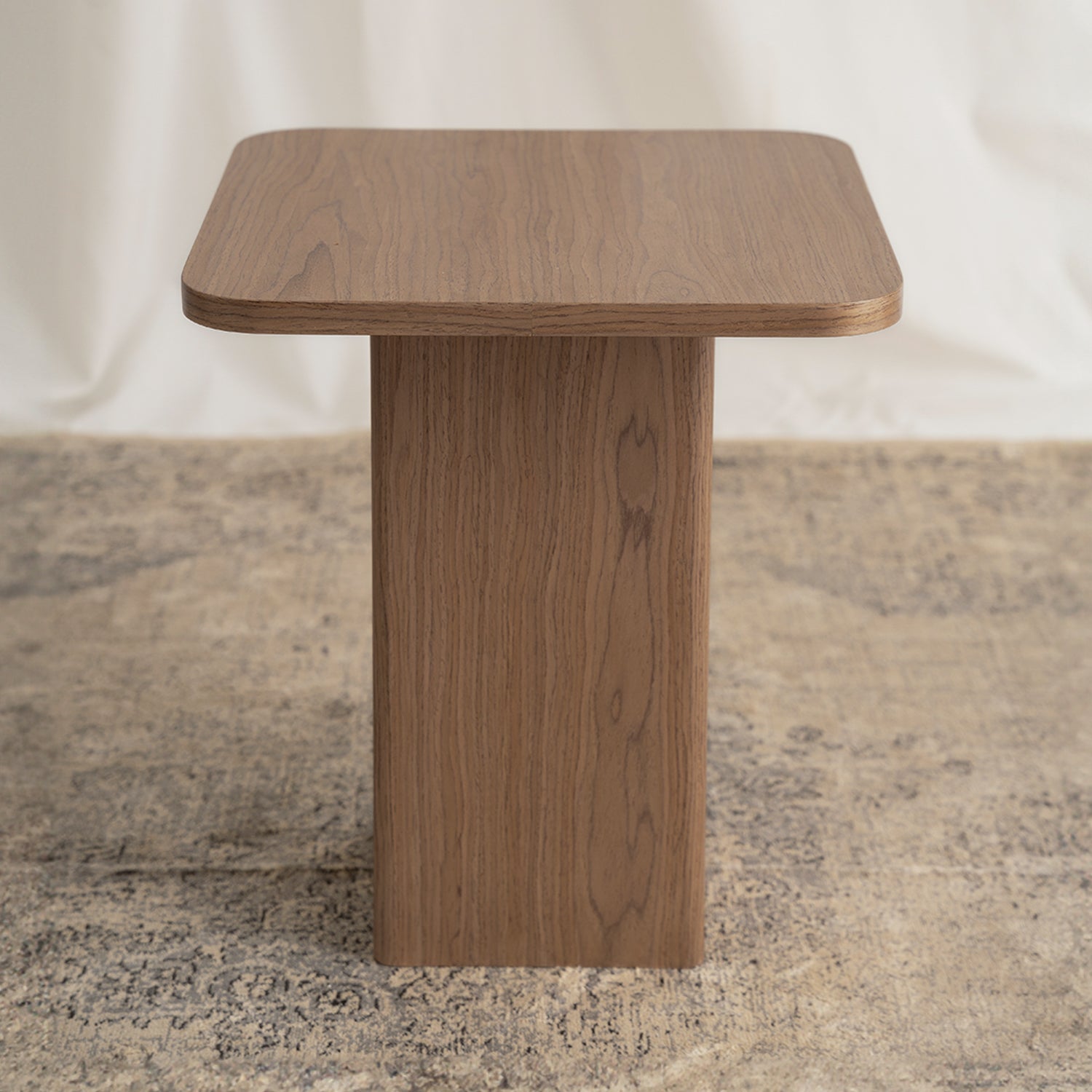 Su estructura ortogonal se suaviza con sutiles curvas en el tablero y la base, creando una sensación de armonía. La textura natural de la madera es la verdadera protagonista.